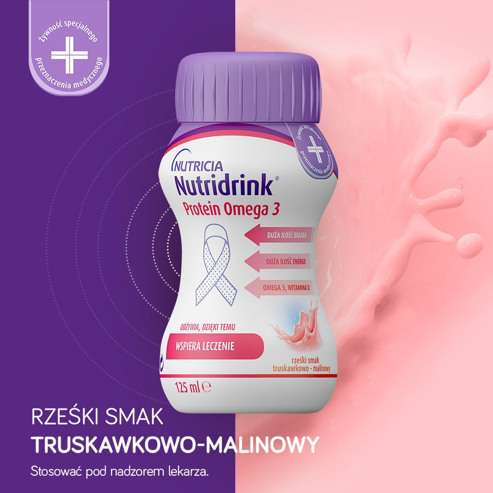 Nutridrink Protein Omega 3 o smaku truskawkowo - malinowym: białka mleka krowiego, woda, maltodekstryna, sacharoza, olej rybi (zawiera soję), oleje roślinne (olej rzepakowy, olej słonecznikowy), aromaty, wodorofosforan magnezu, emulgator (lecytyny (lecytyna sojowa), chlorek choliny, barwnik (karmin), L-askorbinian sodu, cytrynian potasu, wodorofosforan dipotasu, mleczan żelaza(II), glukonian miedzi(II), D-pantotenian wapnia, octan DL-alfa-tokoferylu, siarczan cynku, nikotynamid, siarczan manganu, chlorowodorek pirydoksyny, fluorek sodu, ryboflawina, chlorowodorek tiaminy, octan retinylu, kwas pteroilomonoglutaminowy, chlorek chromu(III), jodek potasu, molibdenian(VI) sodu, D-biotyna, selenian(IV) sodu, fitomenadion, cholekalcyferol, cyjanokobalamina.